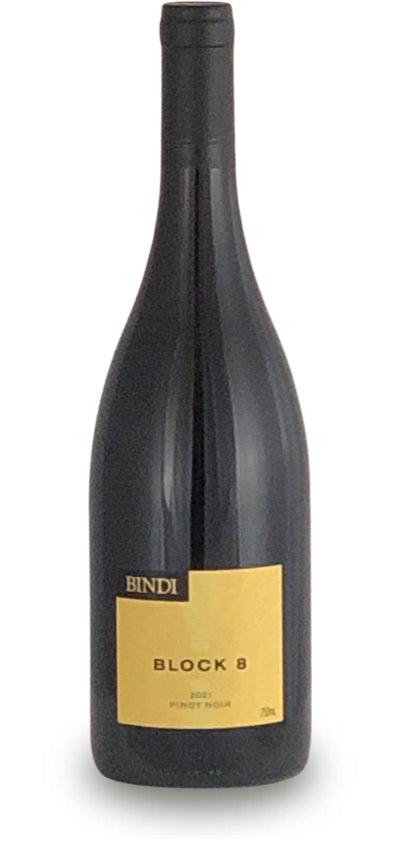 "The Block 8 vineyard is 3/4 of a hectare in size on a sheltered, north-west facing, and very quartz riddled site with some fertile volcanic soils. The eighth block planted at Bindi has a grandstand exposition sweeping down the mid slope. Here there are mostly 11,300 vines per hectare with a Crazy section at 22,600 vines per hectare featuring seven clones. The wines from this vineyard are compelling and delicious when young and as history has shown, going back to the 1992 Bindi Pinot Noir, the wines age exceptionally well from the beginning and drink beautifully for a long time.The wine spends 15-17 months in French barrels of which about 50% are new. The Block 8 wine has exceptional fruit depth and earthiness and is intensely structured, very long and ageworthy. Production typically varies from 125-200 dozen per vintage.